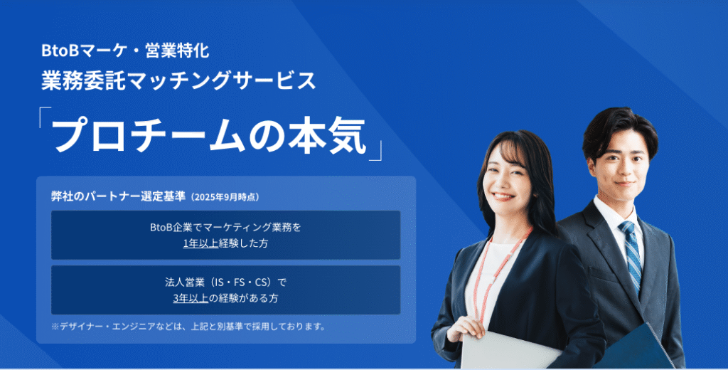 当社の業務委託マッチングサービス「プロチームの本気」なら、BtoBマーケティング・営業領域専門の知見を持ったプロフェッショナルがLP制作を支援します。