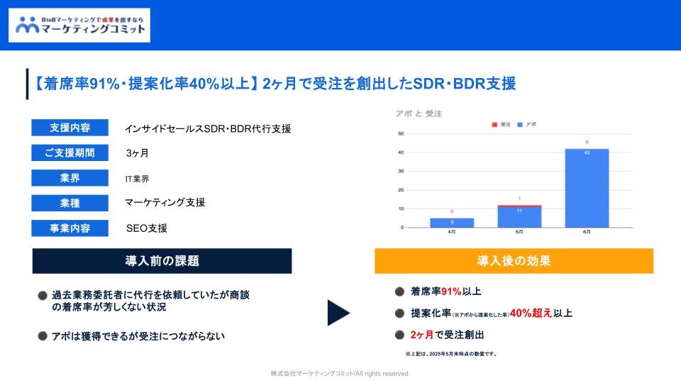 そこで、過去の受注データをもとにターゲット企業の再定義を実施し、企業単位でのアプローチへと転換しました。あわせて、インサイドセールスによるアプローチ内容も見直し、仮説ベースでのヒアリングや提案精度の向上を図りました。その結果、着席率91%以上・提案化率40%以上を実現し、2ヶ月で受注創出につながっています。