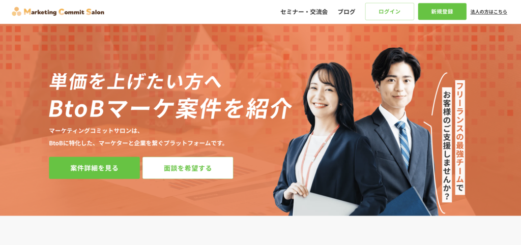 マーケティングコミットサロンでは、BtoBマーケティングや営業領域の案件を中心に、フリーランスや副業人材への案件紹介を行っています。営業の知見や経験を活かしながら、キャリアの可能性を広げたい方は、ぜひチェックしてみてください。