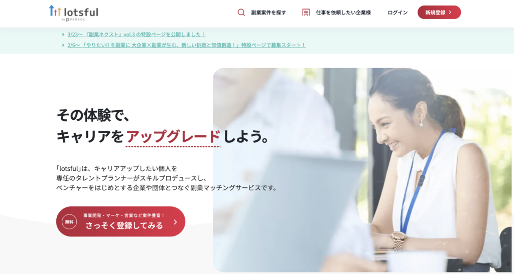 lotsfulは、大手人材企業が運営する副業・フリーランス向けマッチングサービスです。