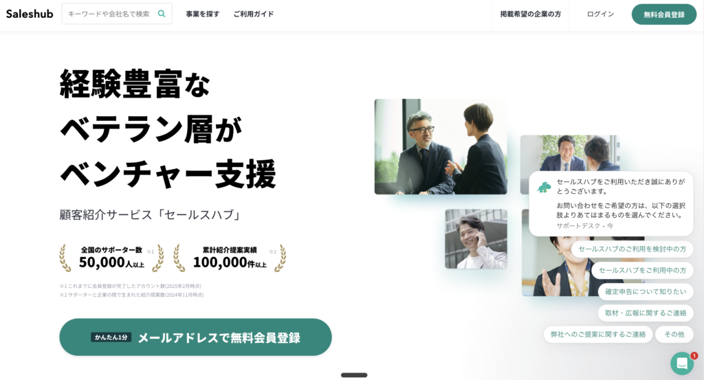 Saleshubは、営業職に特化したマッチングサービスで、フリーランスや副業の営業人材が多く登録しています。