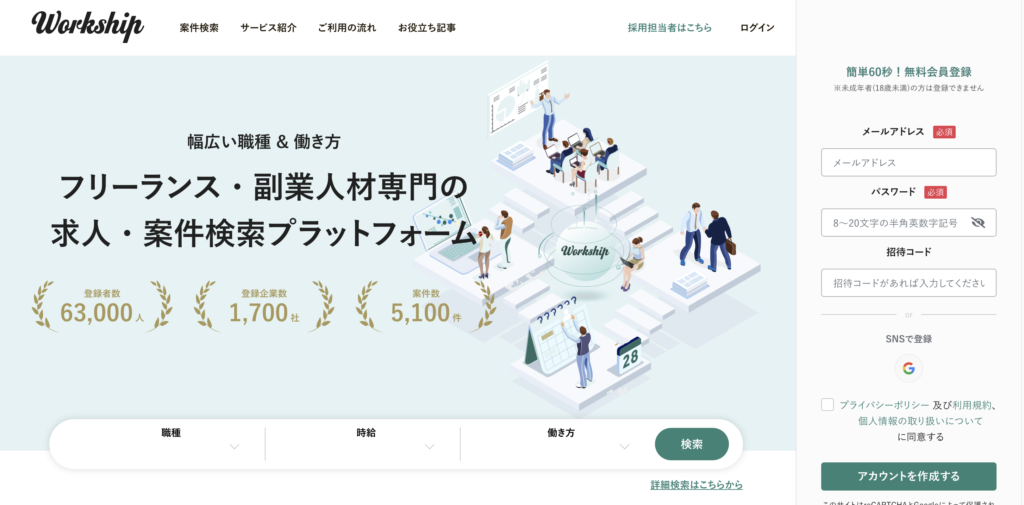 Workshipは、営業・マーケティング領域の案件が豊富なフリーランス向けマッチングサービスです。