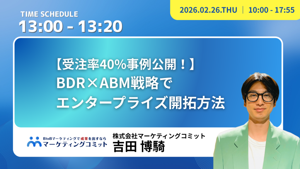 | 13:00-13:20 | 【受注率40%事例公開!】 BDR×ABM戦略でエンタープライズ開拓方法 | 株式会社マーケティングコミット 吉田 博騎 |