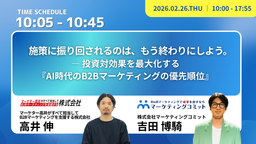 | 10:05-10:45 | 施策に振り回されるのは、もう終わりにしよう。 ―― 投資対効果を最大化する『AI時代のB2Bマーケティングの優先順位』 | マーケター高井がすべて担当して B2Bマーケティングを支援する株式会社 高井 伸 株式会社マーケティングコミット 吉田 博騎 |