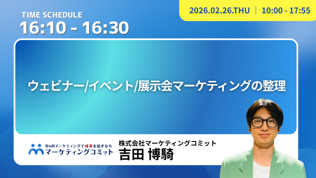 | 16:10-16:30 | ウェビナー/イベント/展示会マーケティングの整理 | 株式会社マーケティングコミット 吉田 博騎 |