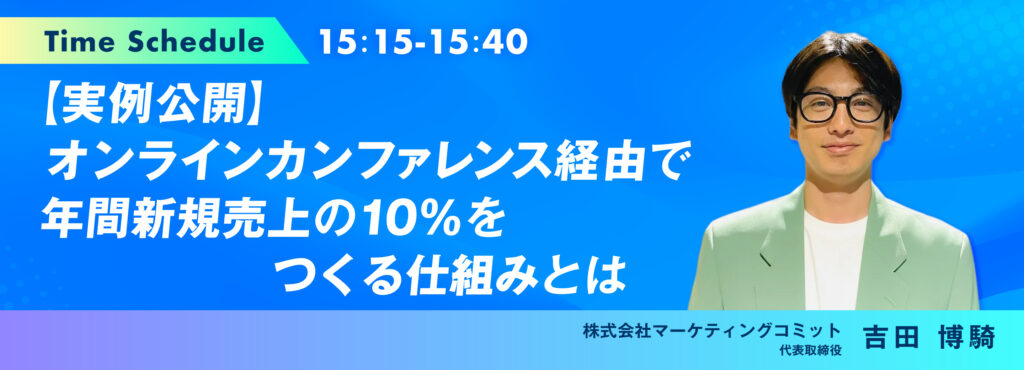 | 11:20-11:45 | ウェビナーを5年実施して分かった 「KPI設定の最適解」と「商談設定の3つのコツ」 | 株式会社ネクプロ 茂木 優弥 |
